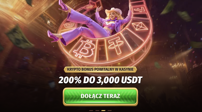 Dla wpłat w kryptowalutach dostępny jest specjalny bonus powitalny z wyższym procentem dopasowania – do 200 % czyli 3 000 USDT. Akceptowane są Bitcoin, Ethereum, USDT, Solana, DOGE i inne kryptowaluty.